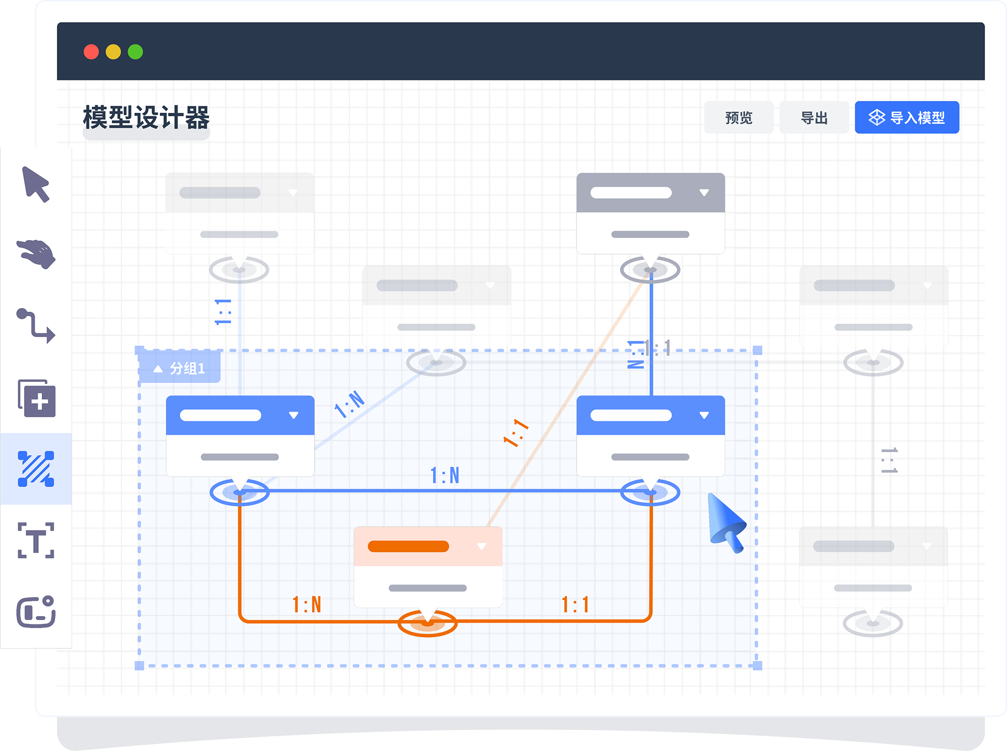 基于用户故事设计业务模型 ,采用图形化方式完成er图设计 ,支持多层分组 ,面向复杂模型也可以条理清晰 ,模型支持预览 、导入 、导出 。