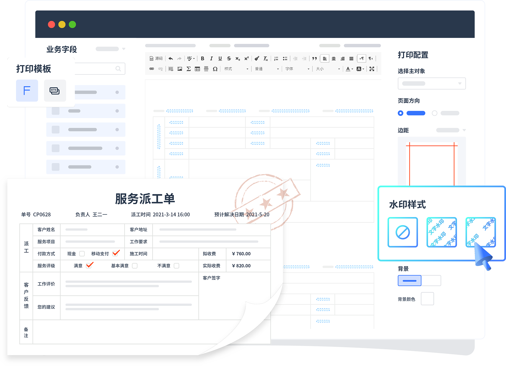 业务场景所需的打印/输出文档也支持自定义 ,关联系统内数据支持水印等辅助配置 。